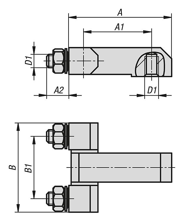 Charnières carrées avec écrous de fixation et partie centrale rallongée pour portes encastrées.