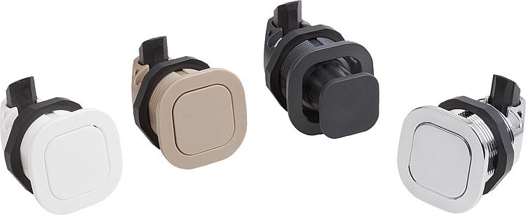 Matière :PC/ABS.Finition :noir, chromé, blanc ou beige.Mode d'emploi :À l'état non actionné, le bouton est encastré dans le corps. En appuyant sur l'élément de commande, celui-ci ressort et la fermeture peut être ouverte en tournant vers la gauche ou vers la droite.