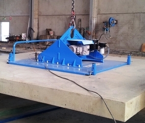 5 tonnes de capacité pour ce palonnier modulable destiné à manipuler des dalles "pointe de diamant" préfabriquées en béton. Ce palonnier électrique est équipé d'une puissante pompe à vide offrant un gros débit d'aspiration, et d'un patin spécifique interchangeable : selon l'évolution des formats de pièces à manipuler, de nouveaux patins-ventouses peuvent être adaptés sur le châssis principal du palonnier, ce qui en fait un appareil très polyvalent. Utilisable en intérieur comme en extérieur (pompe capotée), il peut être fourni avec un groupe électrogène embarqué sur demande. Vous ne trouvez pas le modèle que vous cherchez ? Nous fabriquons chaque année plus de 100 palonniers à ventouses, avec l'appui de notre Bureau d'Etudes intégré. Contactez-nous !