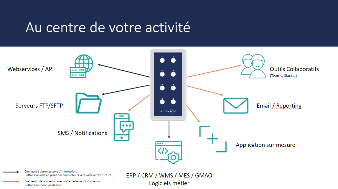 Il peut être interopérable avec les outils métier de votre entreprise (ERP, WMS, MES, BI...) ou seulement envoyer des SMS, mails, messages teams...
