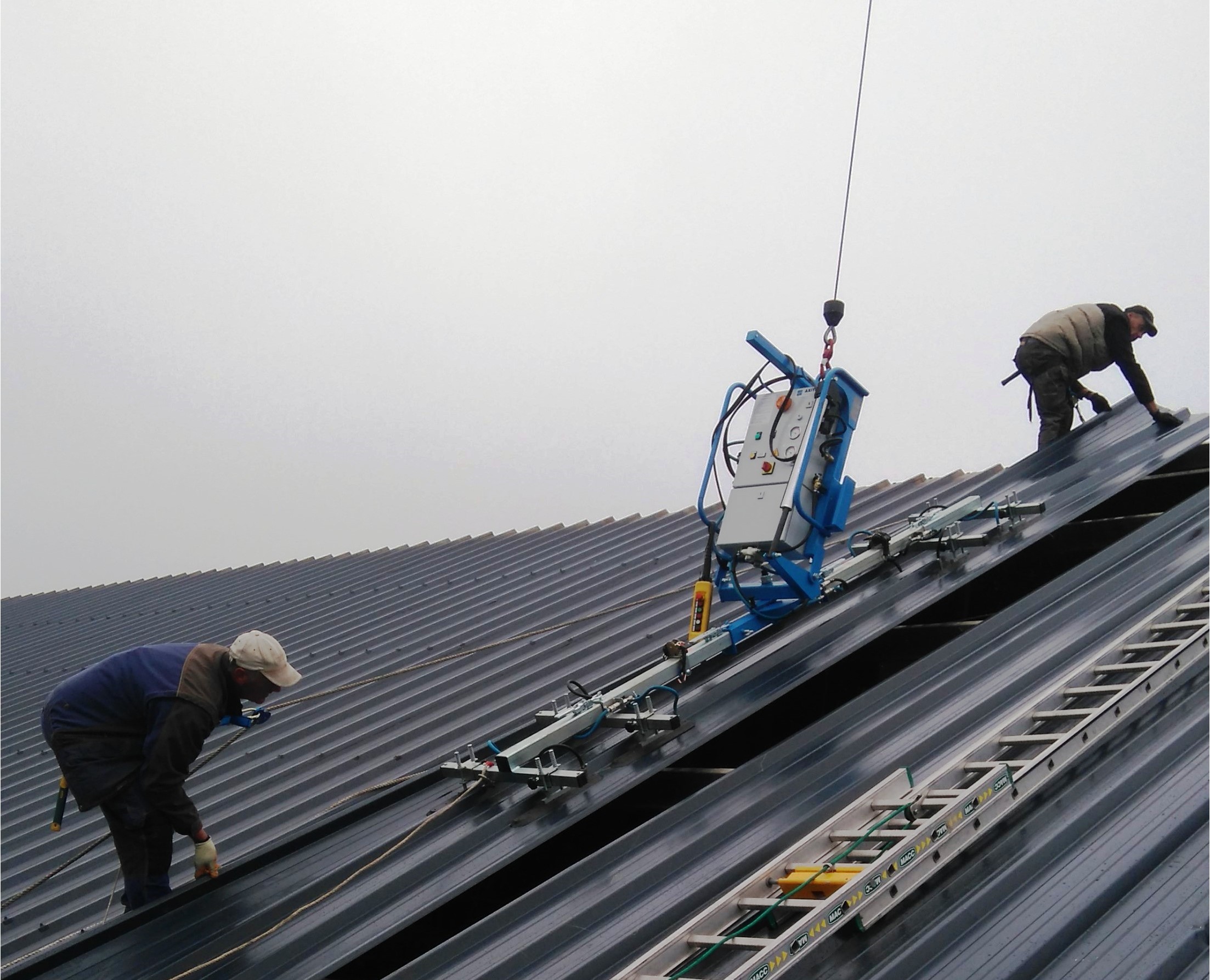 Un palonnier spécifique pour poser des panneaux sandwich en couverture et bardage. Les panneaux, dont les longueurs s’échelonnent de 2,5 à 15 mètres, offrent, selon les fabricants, des structures et des reliefs très différents (lisses, rainurés, avec petites ou grandes vagues…). La structure de ce palonnier à ventouses est évolutive : le produit offre une structure de base, sur laquelle viennent se greffer plusieurs rallonges emboîtables (simples ou avec ventouses) pour adapter l’appareil aux longueurs manipulées. Le lève panneaux sandwich, démontable sans outils, se transporte facilement sur chantier, et ses batteries lui donnent un grande autonomie d'utilisation sans raccordement électrique. Le palonnier à ventouses spécial panneaux sandwich est orientable et permet aussi bien la pose de bardage horizontal ou vertical, que la pose de panneaux de couverture avec des inclinaisons variables.