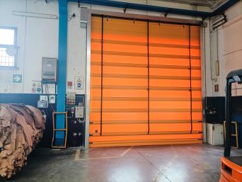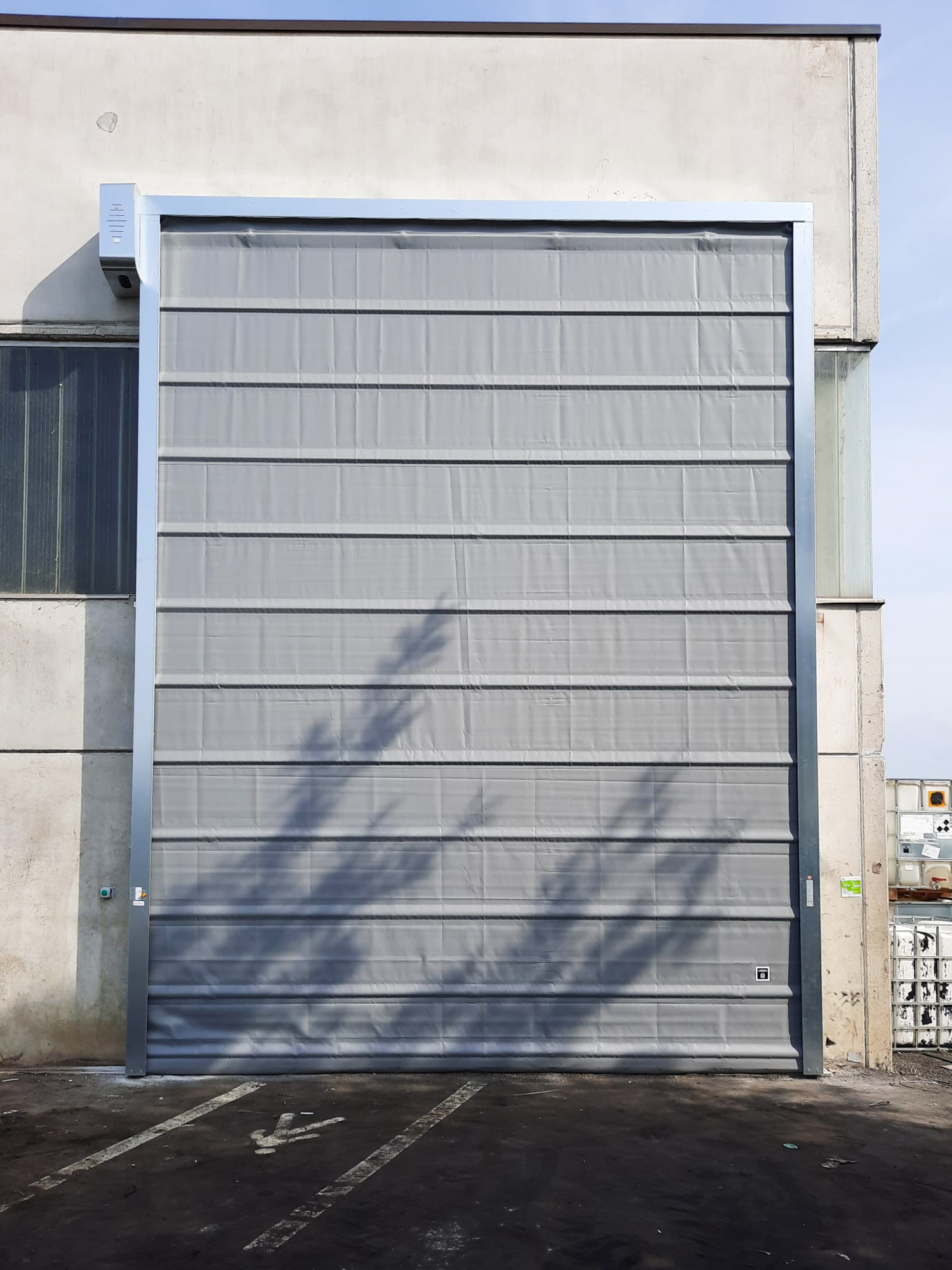 Elle se distingue des portes à enroulement par ses dimensions plus importantes, l'absence d'étanchéité à l'air et le mécanisme d'ouverture du rideau. FOLD-UP® est équipé d'un rideau en PVC rigidifié par des tubes métallique.