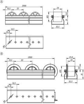 Rails à rouleaux résistants et silencieux. Le dispositif est livré entièrement monté. Dans le profilé pour rails à rouleaux se trouvent des rouleaux en plastique montés sur des axes en acier. Les entraxes étroits garantissent un fonctionnement silencieux et fluide. Si nécessaire, le profilé pour rails à rouleaux en tôle d'acier peut être facilement coupé à la longueur souhaitée.