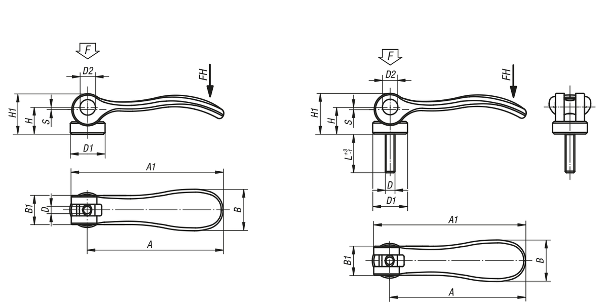 Levier à serrage rapide en aluminium avec taraudage ou filetage, rondelle de pression en plastique et goujon fileté en acier ou en inox, pouces