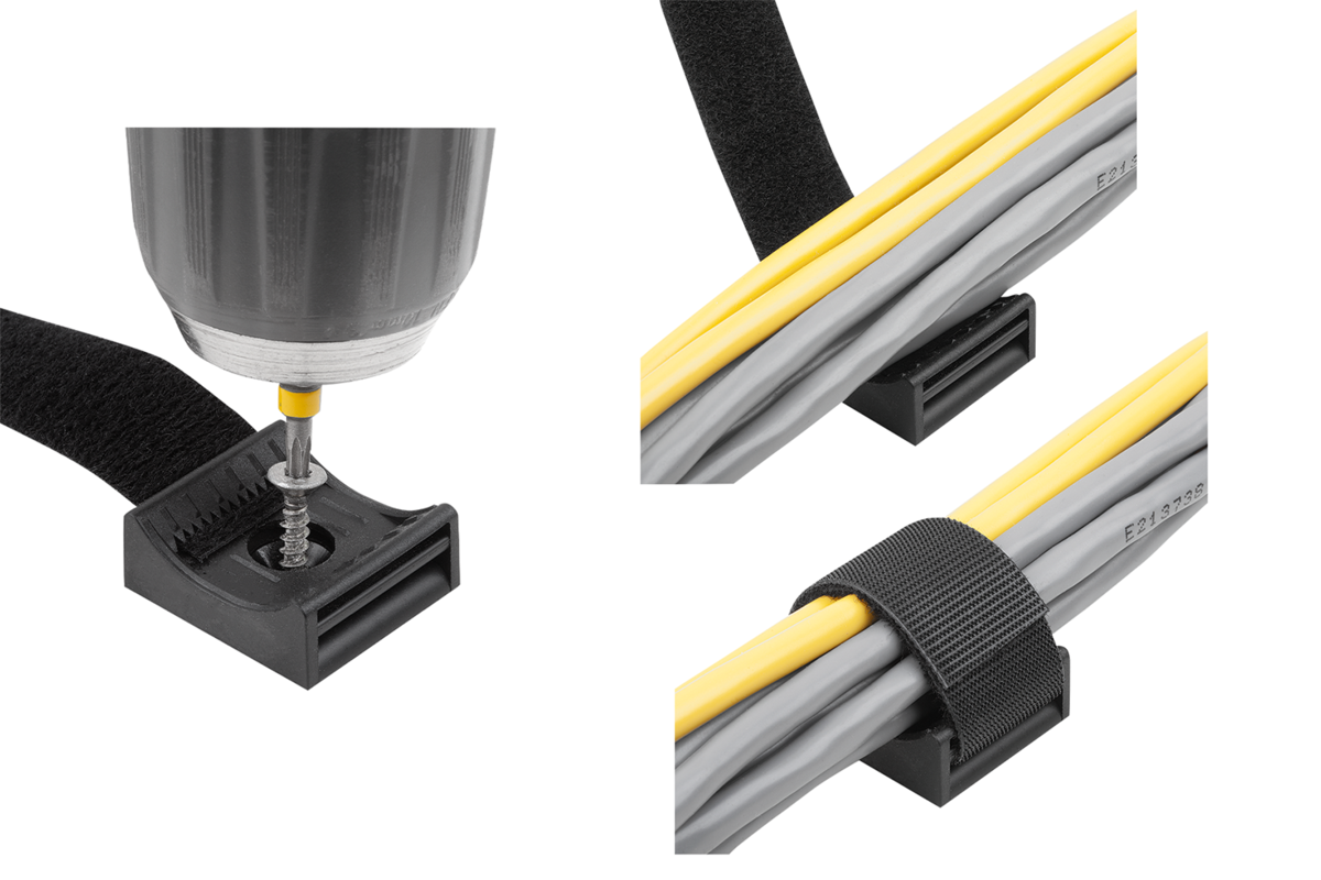 Ce socle auto-agrippant sert d'aide à l'installation pour fixer en douceur les fils, câbles et tuyaux. Ce socle est déjà équipé d'une bande Velcro. La bande Velcro peut être retirée du socle et insérée sans outil. La bande Velcro peut être ouverte et fermée des centaines de fois.