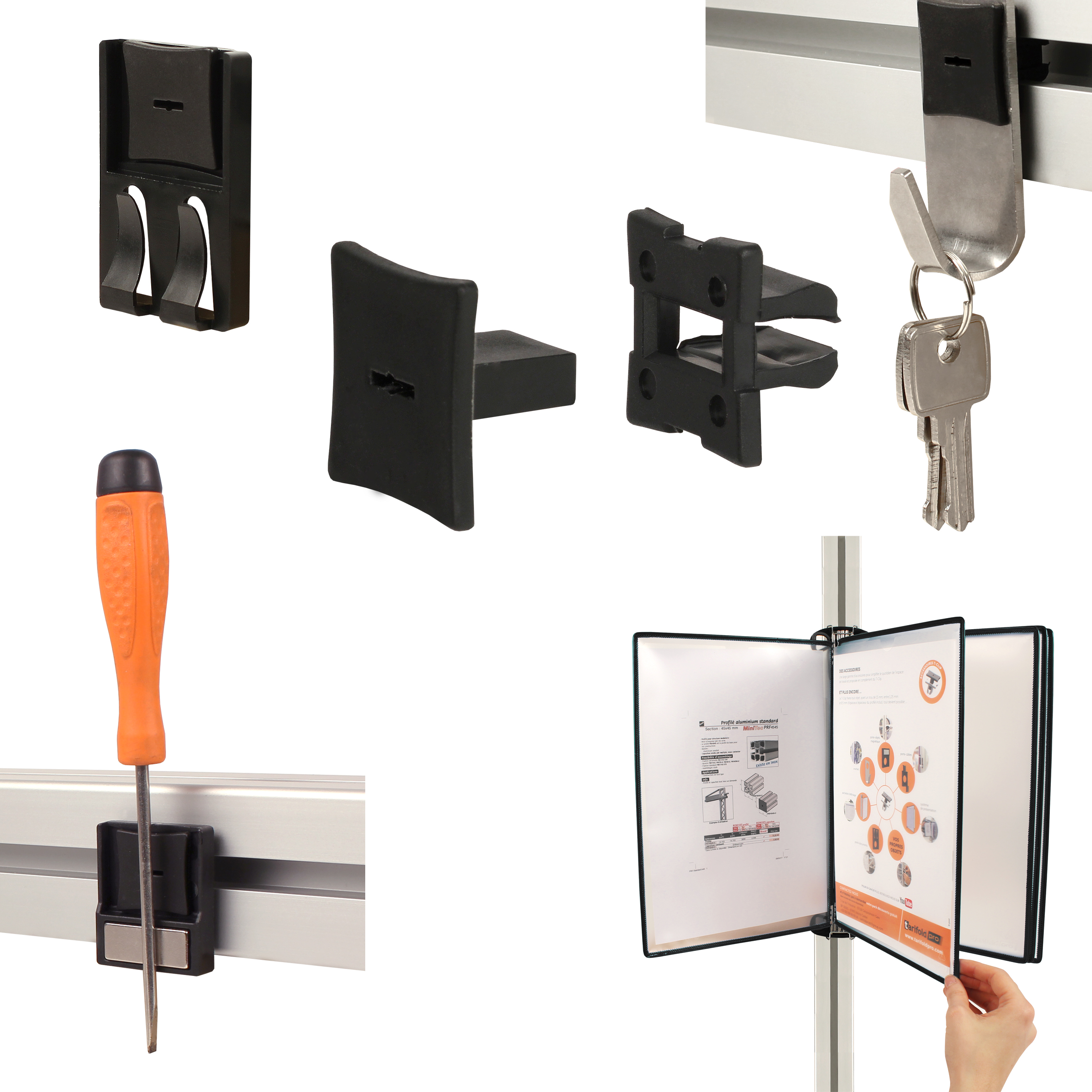 ENGRENAGES HPC agrandit sa gamme d’accessoires pour profilés aluminium avec un système de fixation innovant qui s’adapte sur quasiment tous les profilés. Grâce à sa forme brevetée, le T-Clip se monte dans les rainures de 8 ou 10mm de la plupart des profilés du marché. Cet accessoire de fixation peut tenir n’importe quel objet jusqu’à 5kg. Le T-Clip est composé d’un insert et d’une clé et aucun outil n’est nécessaire au montage. Il permet notamment de monter n’importe quel élément du moment qu’il possède un trou diamètre 15mm. De nombreux accessoires sont proposés par HPC : - Un porte-document muni de 2 languettes pour clipper de 1 à 5 feuilles sur les profilés aluminium - Un porte-câble muni de 2 embases afin de faire cheminer 2 faisceaux. L’avantage est de pouvoir fixer les câbles à l’horizontale comme à la verticale. Il n’est plus nécessaire de passer autour des profilés pour fixer les câbles. - Un crochet pour suspendre des objets divers (balayettes, clés, chiffons etc.) - Un porte-objet magnétique pour maintenir des objets métalliques divers - Des poches à pivots pour une visualisation et une fixation rapide de documents. L’ensemble complet est composé de supports, poches plastiques, embouts magnétiques et bloques-poches.