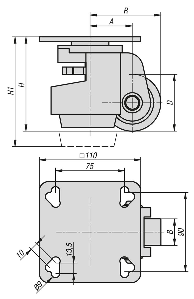 Roue de levage avec pied réglable fixe intégré. Avec roulement à billes étanche dans la couronne de pivotement. Réglage de la hauteur au moyen d’une clé à fourche SW 13 ou d’une molette de réglage intégrée. Axe de roue vissé.