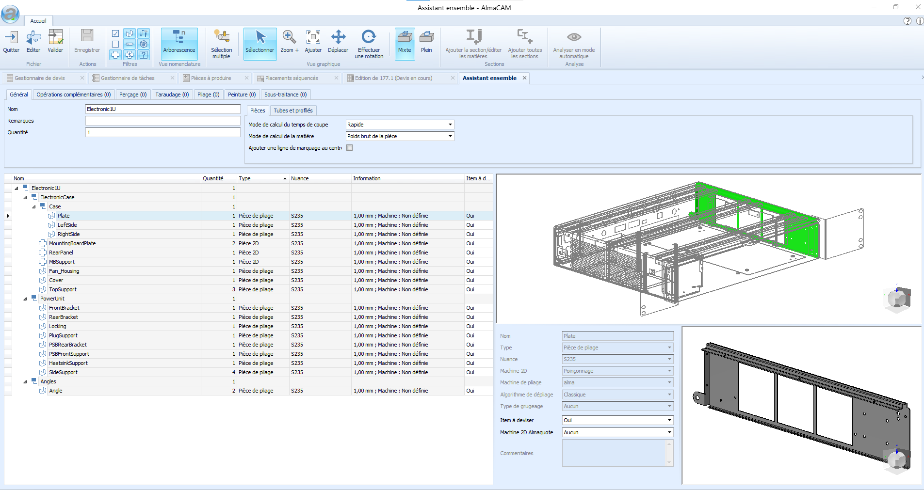 La récupération d’assemblages conçus en CAO en vue du chiffrage (devis) ou de la fabrication (FAO tôlerie) nécessite souvent plusieurs outils logiciels. Cette opération fastidieuse est très consommatrice de temps. Le module Assembly2cam intégré au logiciel Almacam rend l’import d’assemblage simple et rapide. Il permet de traiter tous types de pièces composant l’assemblage (pièces en tôle, tubes et fournitures), aussi bien pour le devis que pour la fabrication.