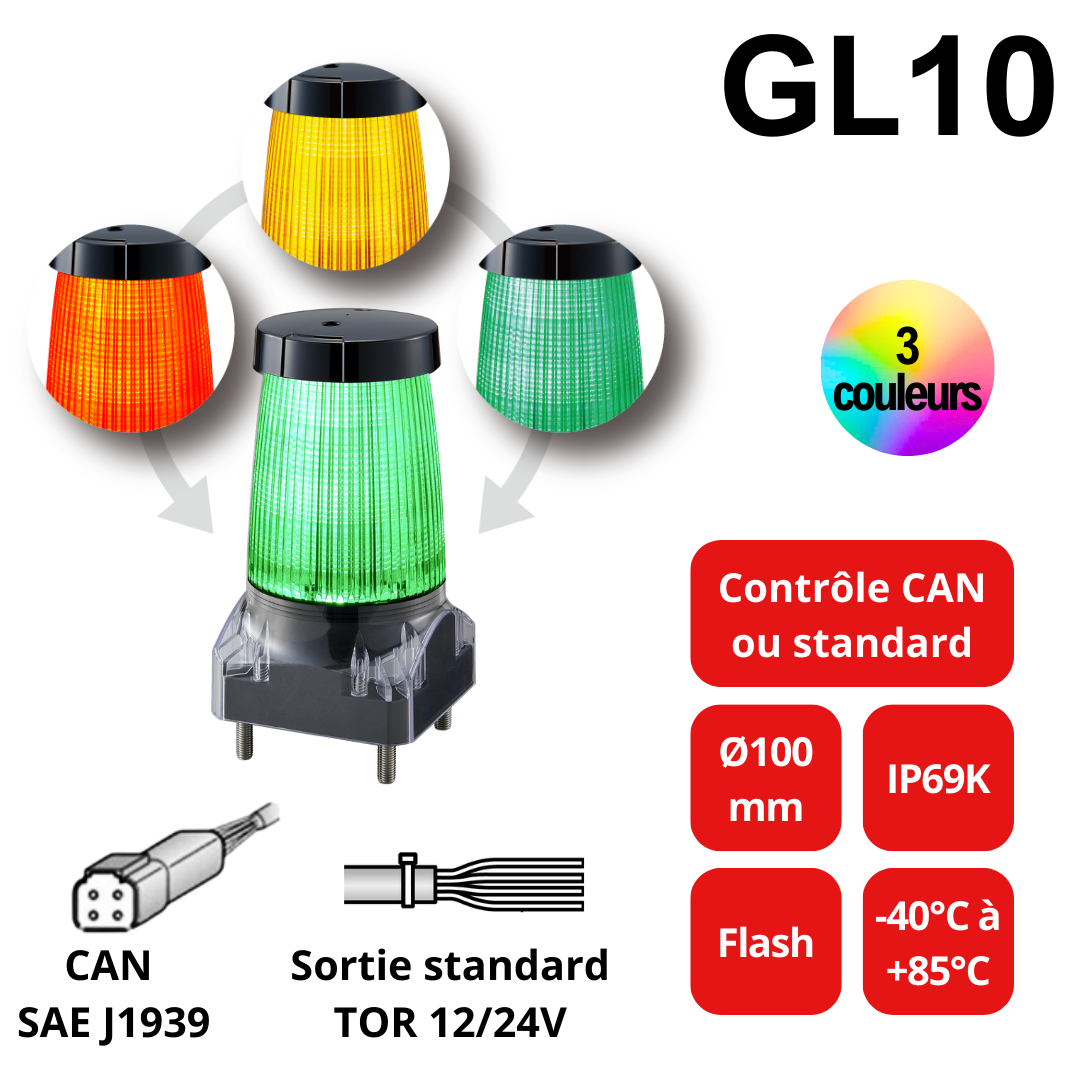 - GL10-M1NC1-T : contrôle par communication CAN (CANbus, SAE J1939) adapté aux engins de chantier, 13 types de flash pouvant être définis via commande CAN, acquisition et surveillance des états (couleur et flash)