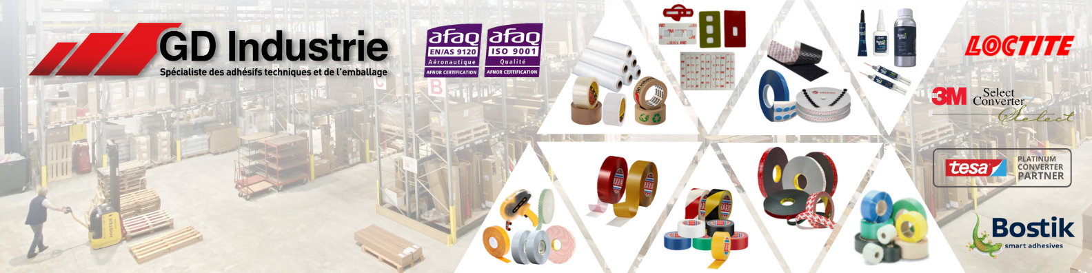 GD Industrie, spécialiste des adhésifs techniques et de l'emballage, commercialise une large gamme d'adhésif, de colle, de produits et de machines dédiés à l'emballage et d'équipements concernant l'hygiène et la sécurité.GD Industrie est accrédité :Distributeur d'adhésif préféré 3MDistributeur et platinum converter ...