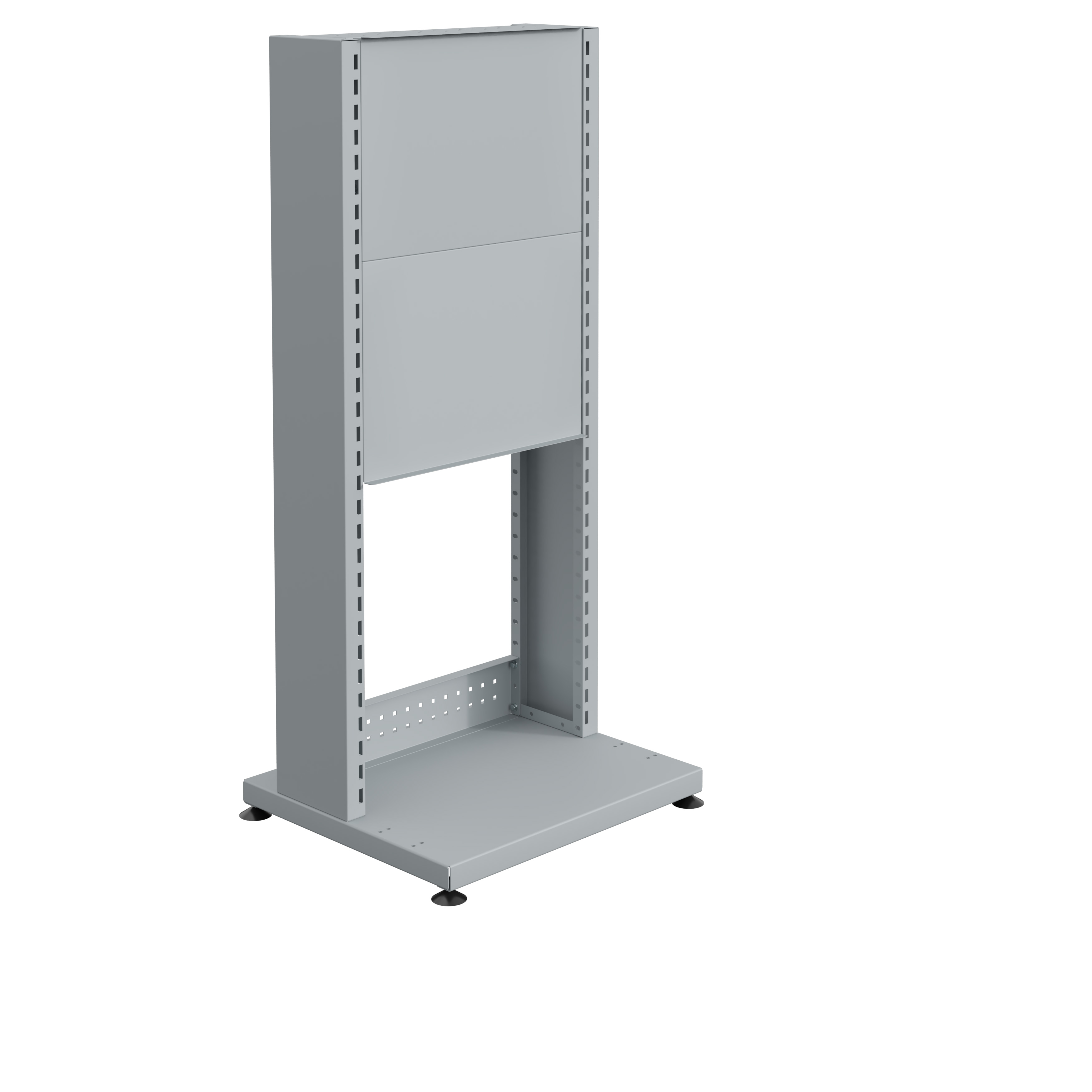 Le support d'affichage DIGIT est doté d'une structure en tôle d'acier pliée de 25/10ème d'épaisseur pour le socle, offrant une base stable et solide. Les 2 montants verticaux en tôle d'acier de 12/10ème d'épaisseur sont perforés. Les perforations sont de deux types : des trous de 10 mm de diamètre sur les faces latérales intérieures et des perforations de 30x10 mm sur les faces avant et arrière, permettant une grande flexibilité d'installation et d'utilisation.