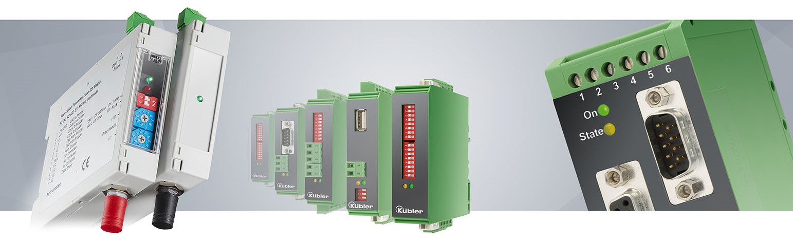 Utilisation polyvalente > Interfaces : Analogiques, parallèles, HTL / TTL, SSI, RS232 / RS485, SinCos > Installation facile sur le profilé-support > Idéal pour la séparation de potentiel > Paramétrage facile > Combinable avec les codeurs Kuebler