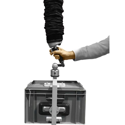 Cet équipement de manutention est composé d’un tube de levage EasyHandPro (système de levage par le vide) et d’un préhenseur de caisses avec une ventouse rectangulaire. Il est également possible d’utiliser le tube de levage EasyHandPro Rapid qui est doté d’une meilleure réactivité et rapidité.