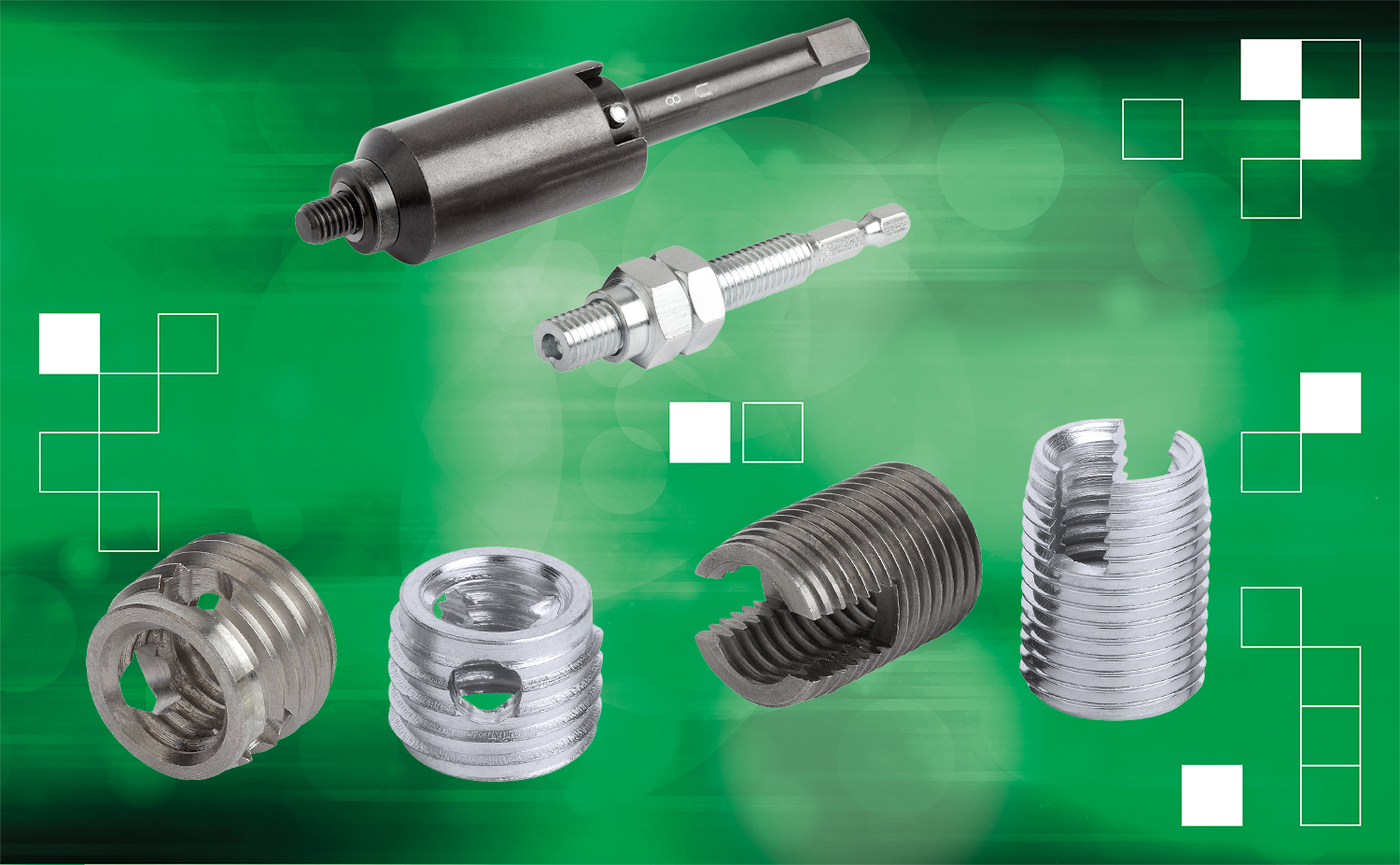Les inserts taraudés en acier cémenté (zingué, passivé jaune, exempt de chrome VI) ou en acier inoxydable créent une forte compression avec le matériau dans lequel ils viennent se loger, sont résistants à la corrosion et faciles à monter. Les inserts taraudés de forme conique avec fente de coupe présentent un effet de réduction de la taille de la fente au niveau de la pointe lors du vissage, en fonction de la dimension du préperçage et de la dureté du matériau dans lequel ils viennent se loger.
