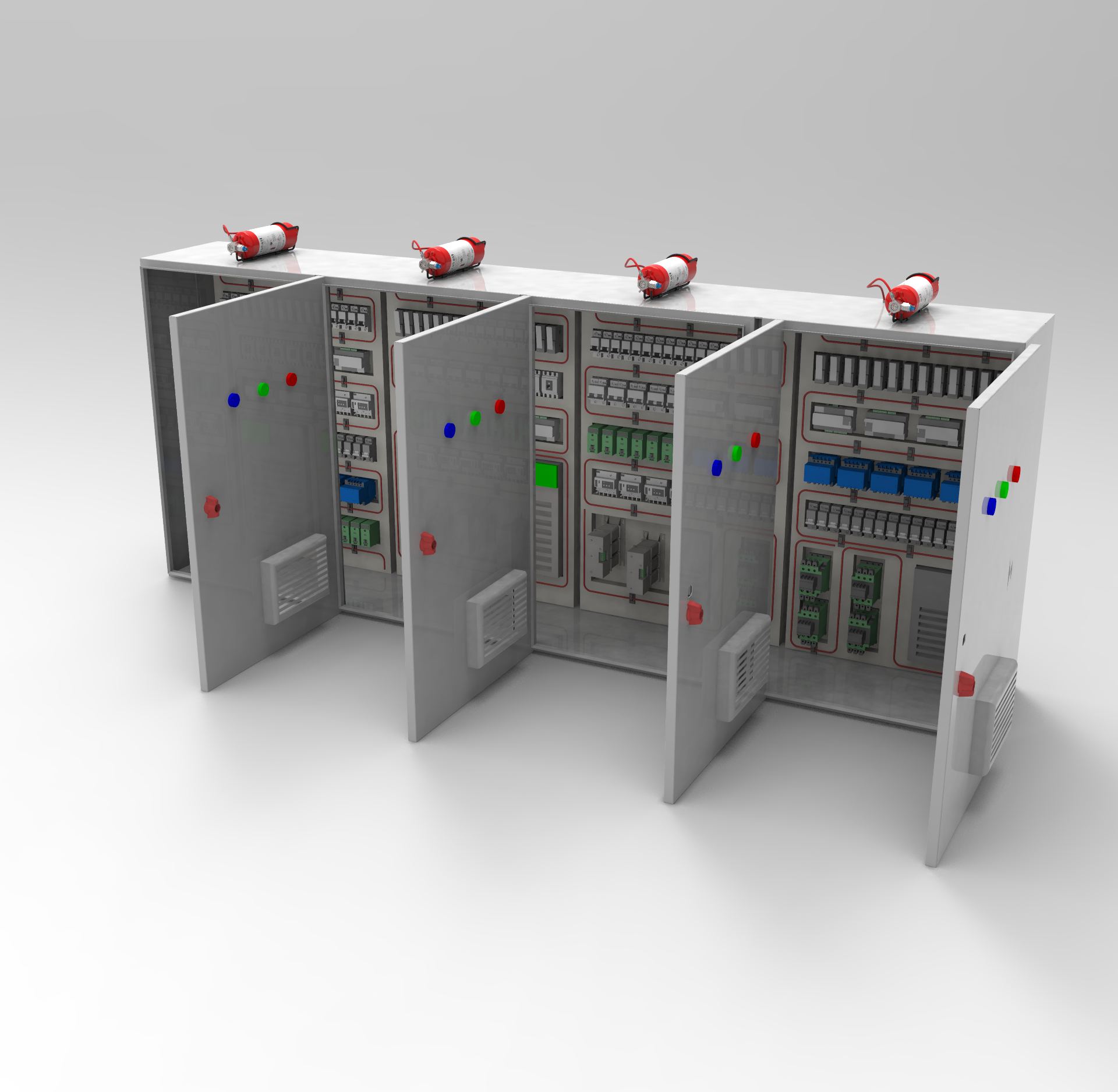 Système complètement autonome permettant la détection et l'extinction en moins de 12 secondes d'un départ de feu dans un TGBT multi-portes avec ou sans séparations internes.