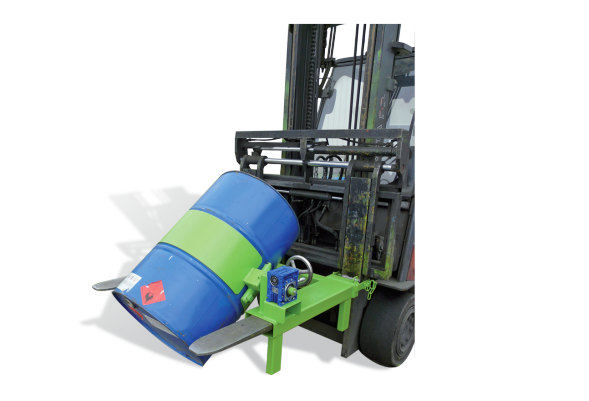 Notre retourneur de fûts RB-3 se monte directement sur les fourches du chariot élévateur.