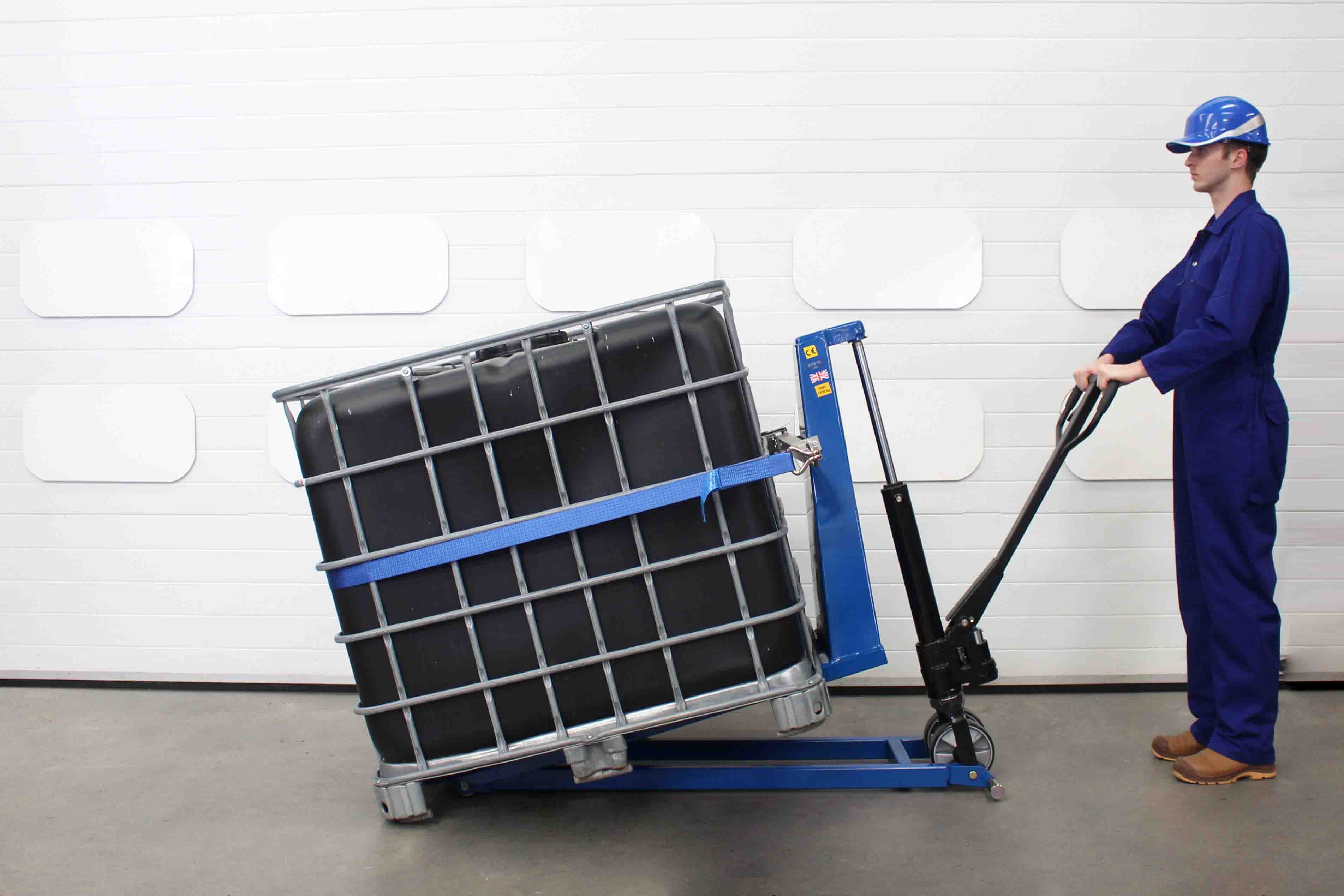 Les fourches de cet appareil sont à la fois solides, robustes et adaptées à des charges allant jusqu’à 1000 kg. Adaptées aux IBC à base ouverte, les fourches ont une largeur de 540 mm pour s’adapter aux conteneurs IBC standards de 1000 litres. Les opérateurs positionnent simplement la machine sous l’IBC, fixent une sangle autour du conteneur, puis activent la poignée pour commencer à l’incliner.