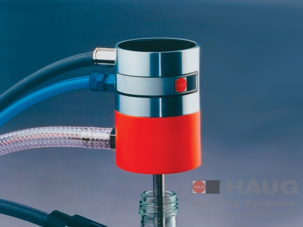 Le système d'ionisation et soufflage à aiguille NI est spécialement conçu pour dépoussiérer les pots, flacons et bouteilles. Le diamètre et la longueur de l'aiguille sont parfaitement adaptés pour cette application spécifique.