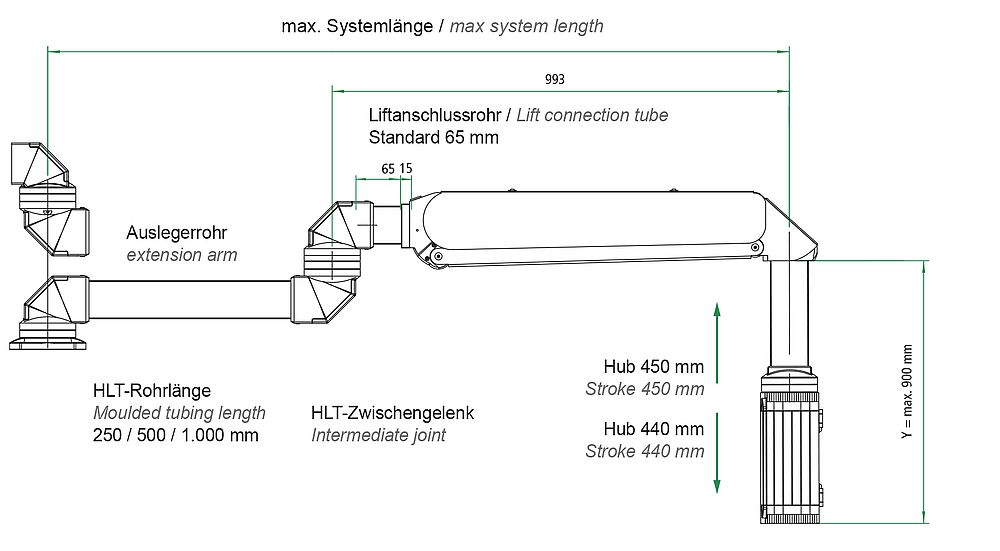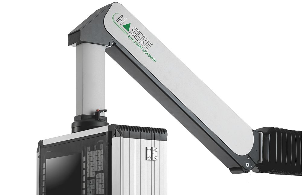 Parmi les nouveaux composants, le bras de suspension HMA380, robuste et réglable en hauteur, est conçu spécialement pour interfaces homme/machine. Ce bras vertical supporte des charges jusqu’à 60kg, avec un débattement vertical de 900 mm. Grâce aux articulations et amortisseurs pneumatiques, il est facilement réglable en hauteur, sans effort et sans à-coup, quel que soit l’espace disponible. Un guidage-câble interne évite une usure prématurée des câbles et un système de frein optionnel permet de régler la dureté du déplacement. En association avec la série des potences horizontales HLT, il permet des mouvements horizontaux et verticaux, pour une meilleure ergonomie autour de la machine.