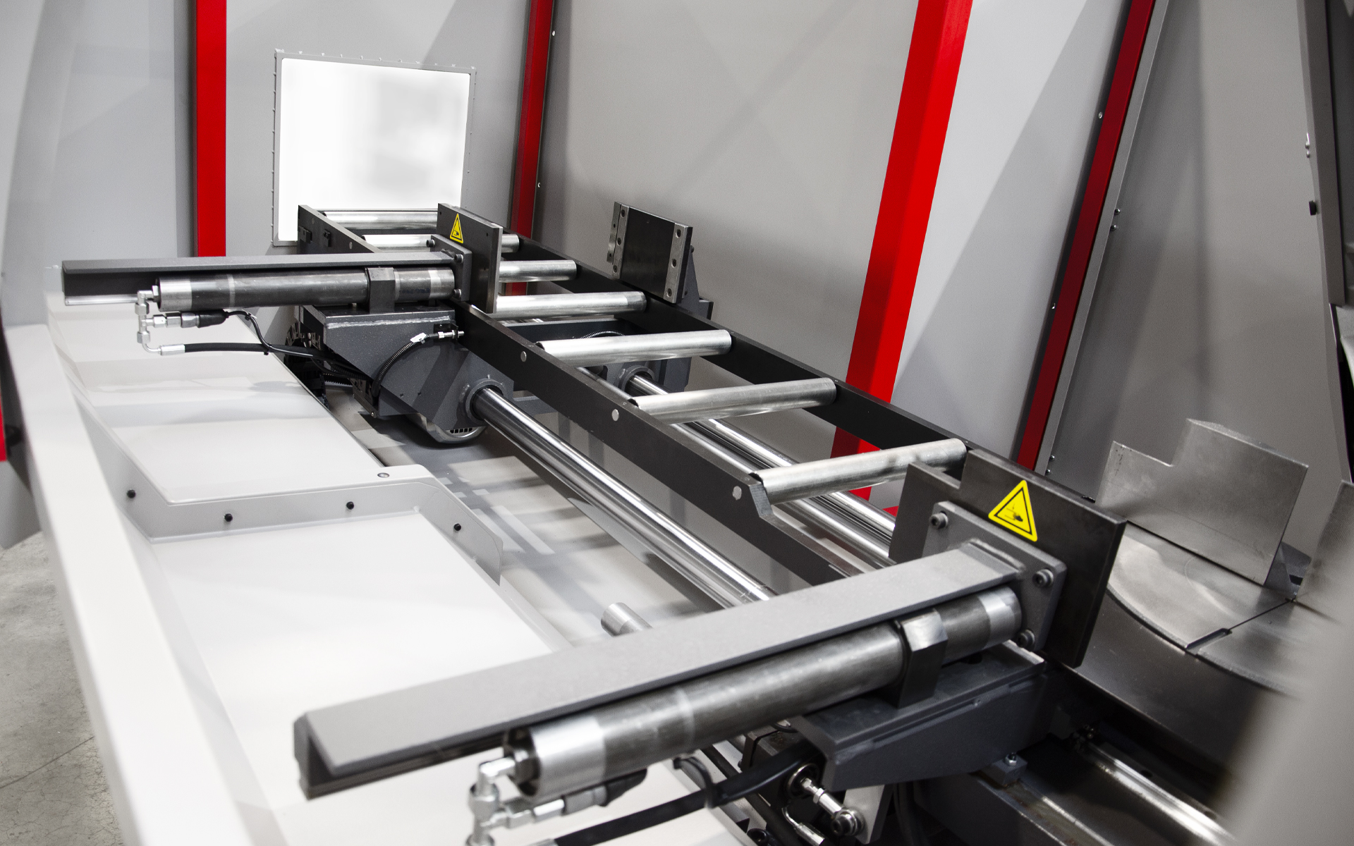 L’étau hydraulique de l'avance barre (monté flottant) se déplace sur 2 colonnes rondes et est entraîné par une courroie crantée et un moteur (lecture de la longueur sur réglet magnétique).