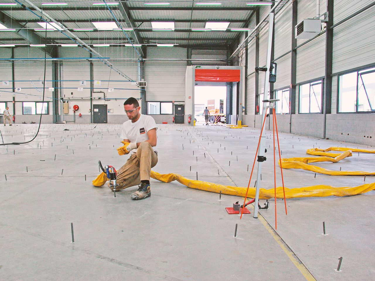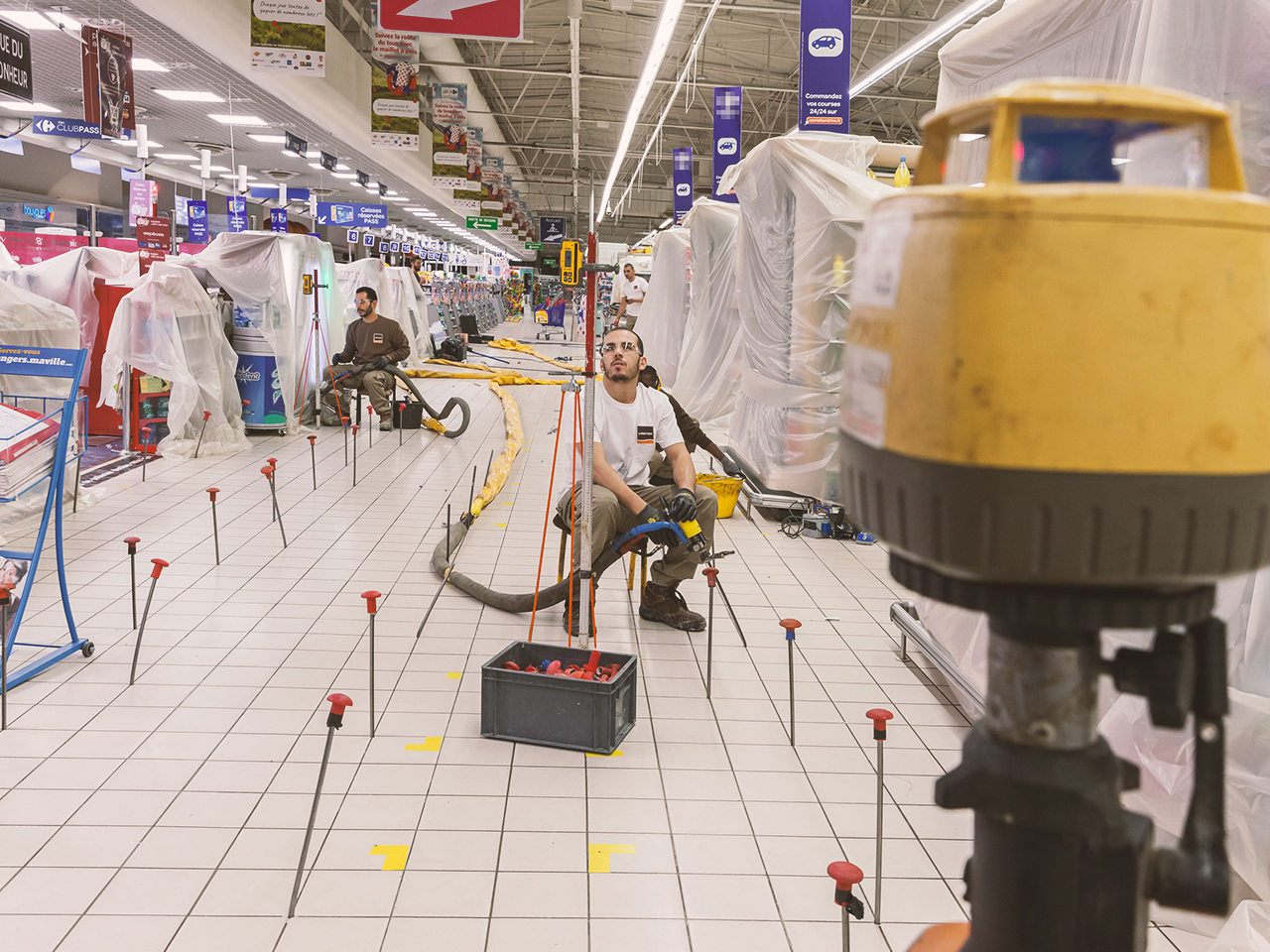 L’opération se déroule sous un contrôle au niveau laser permanent pour vérifier et contrôler l’évolution du relevage des dalles affaissées.