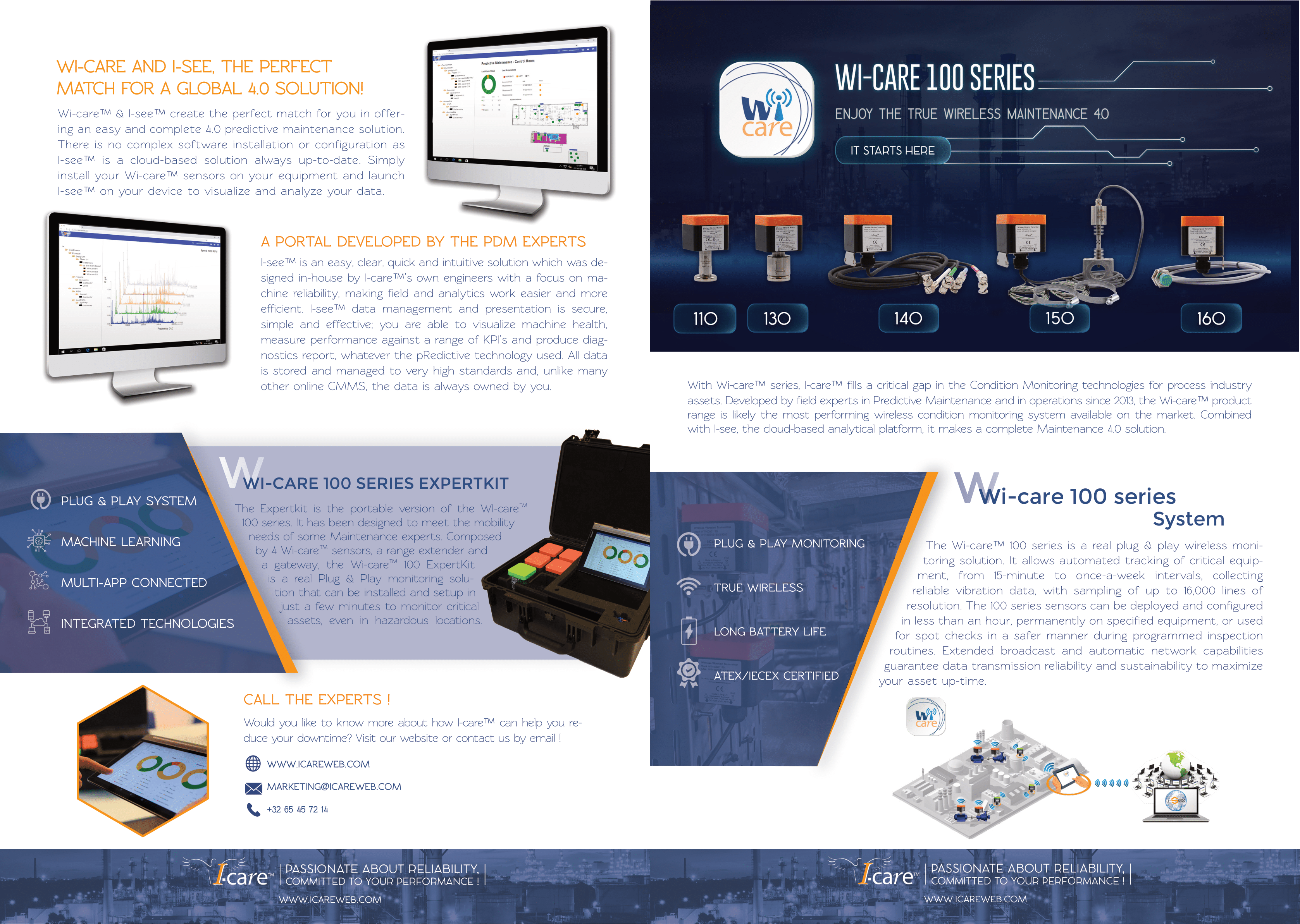 La série Wi-careTM 100 est une véritable solution de monitoring sans fil plug & play. Elle permet le suivi automatisé des équipements critiques, avec des intervalles allant de 15 minutes à une fois par semaine, en recueillant des données de vibration fiables, avec échantillonnage jusqu’à 16 000 lignes de résolution. Les capteurs de la série 100 peuvent être déployés et configurés en moins d’une heure, de façon permanente sur un équipement spécifié ou pour effectuer des contrôles ponctuels de manière plus sûre au cours des procédures d’inspections programmées. Les capacités de diffusion étendue et de réseau automatique garantissent la fiabilité et la durabilité de la transmission des données afin de maximiser le temps de disponibilité de vos actifs.