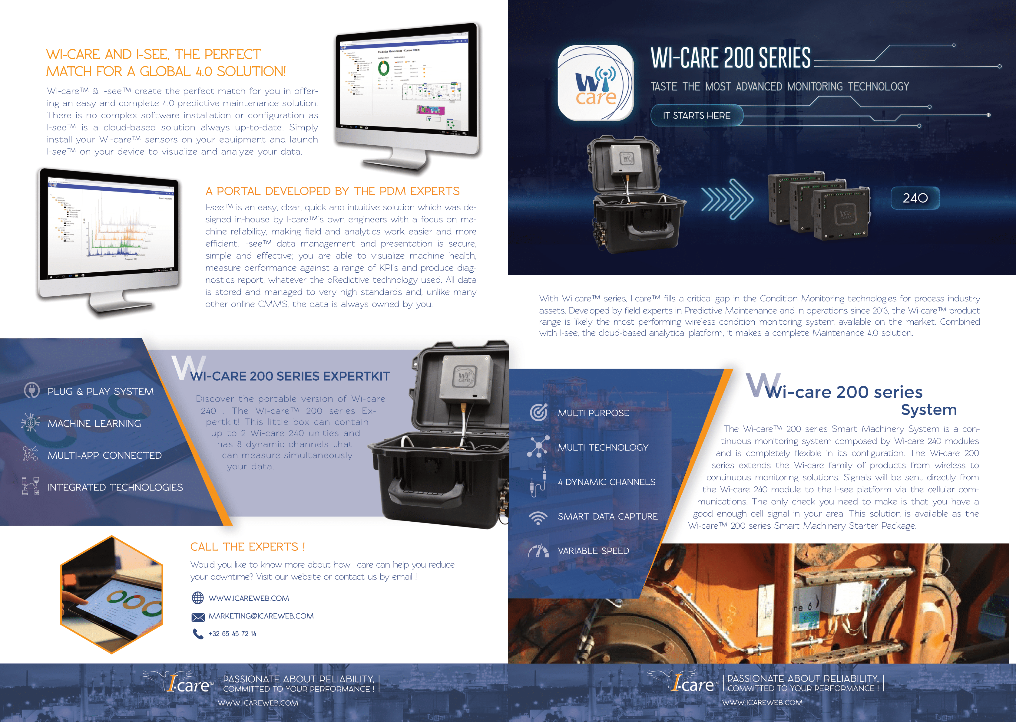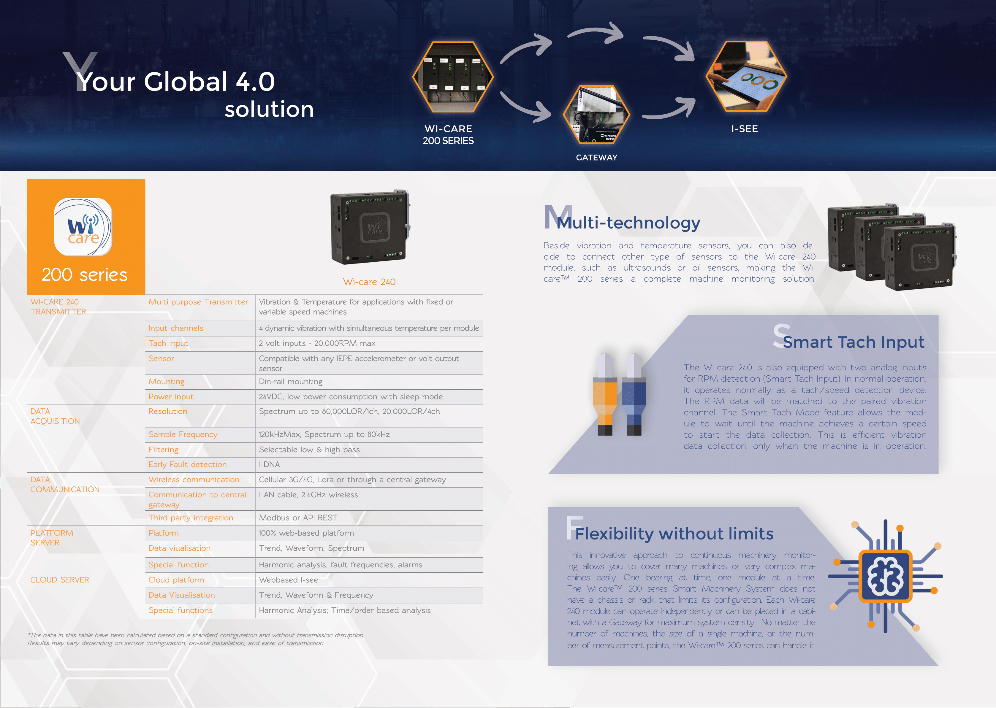 Le système de machinerie intelligente Wi-care™ 200 series est un système de surveillance continue composé de modules Wi-care 240 et est complètement flexible dans sa configuration. La série Wi-care 200 étend la famille de produits Wi-care, des solutions sans fil aux solutions de surveillance continue. Les signaux seront envoyés directement du module Wi-care 240 à la plateforme I-see via les communications cellulaires. La seule vérification que vous devez faire est que vous avez un signal cellulaire suffisamment bon dans votre région. Cette solution est disponible sous la forme du pack de démarrage Wi-care™ 200 series Smart Machinery.