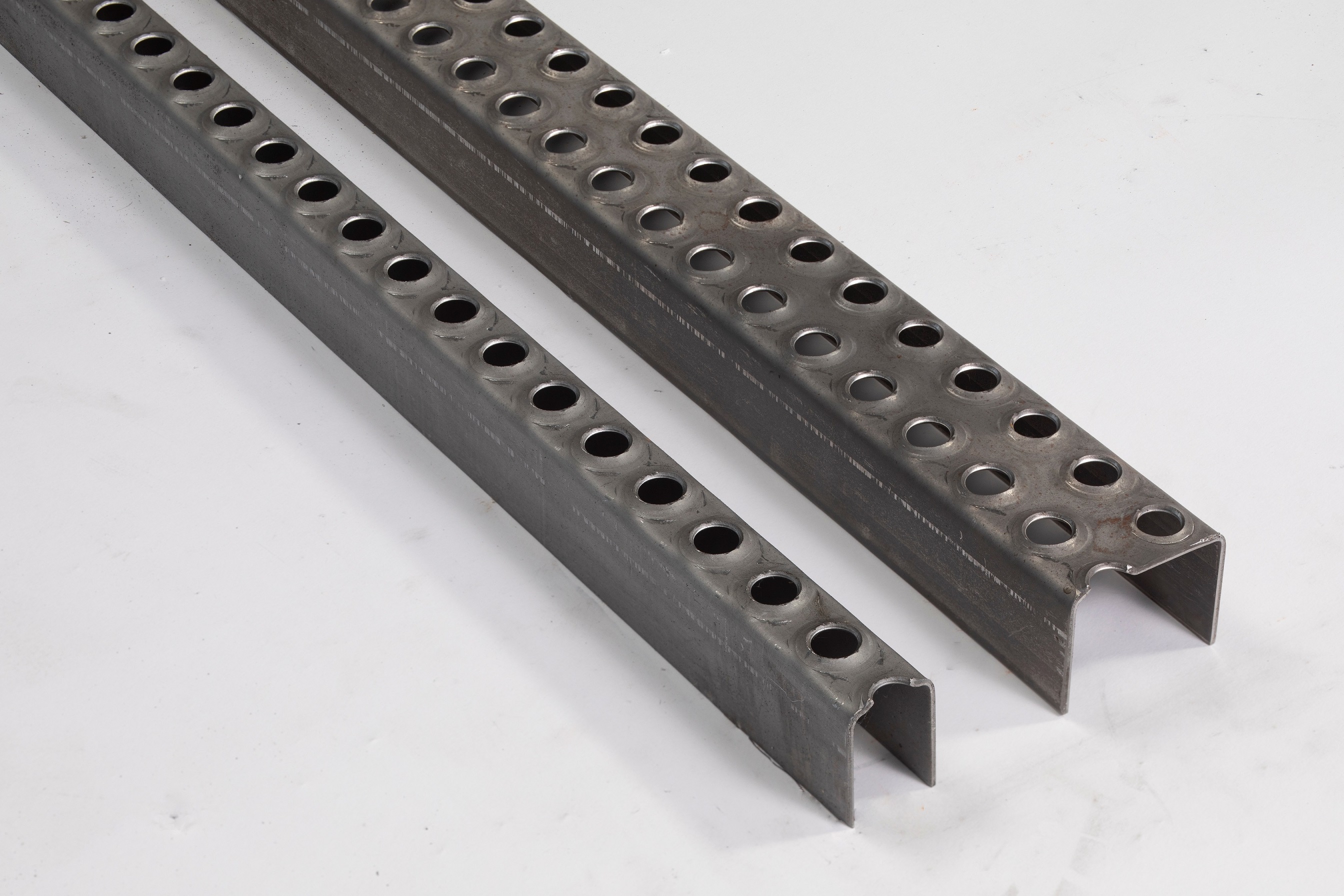 échelons à 1 rangée de perforations (longueur standard : 2000 mm, largeur : 25 mm, hauteur : 39 mm, épaisseur : 2 mm) et échelons à 2 rangées de perforations (longueur standard : 2000 mm, largeur : 50 mm, hauteur : 39 mm, épaisseur : 2 mm).