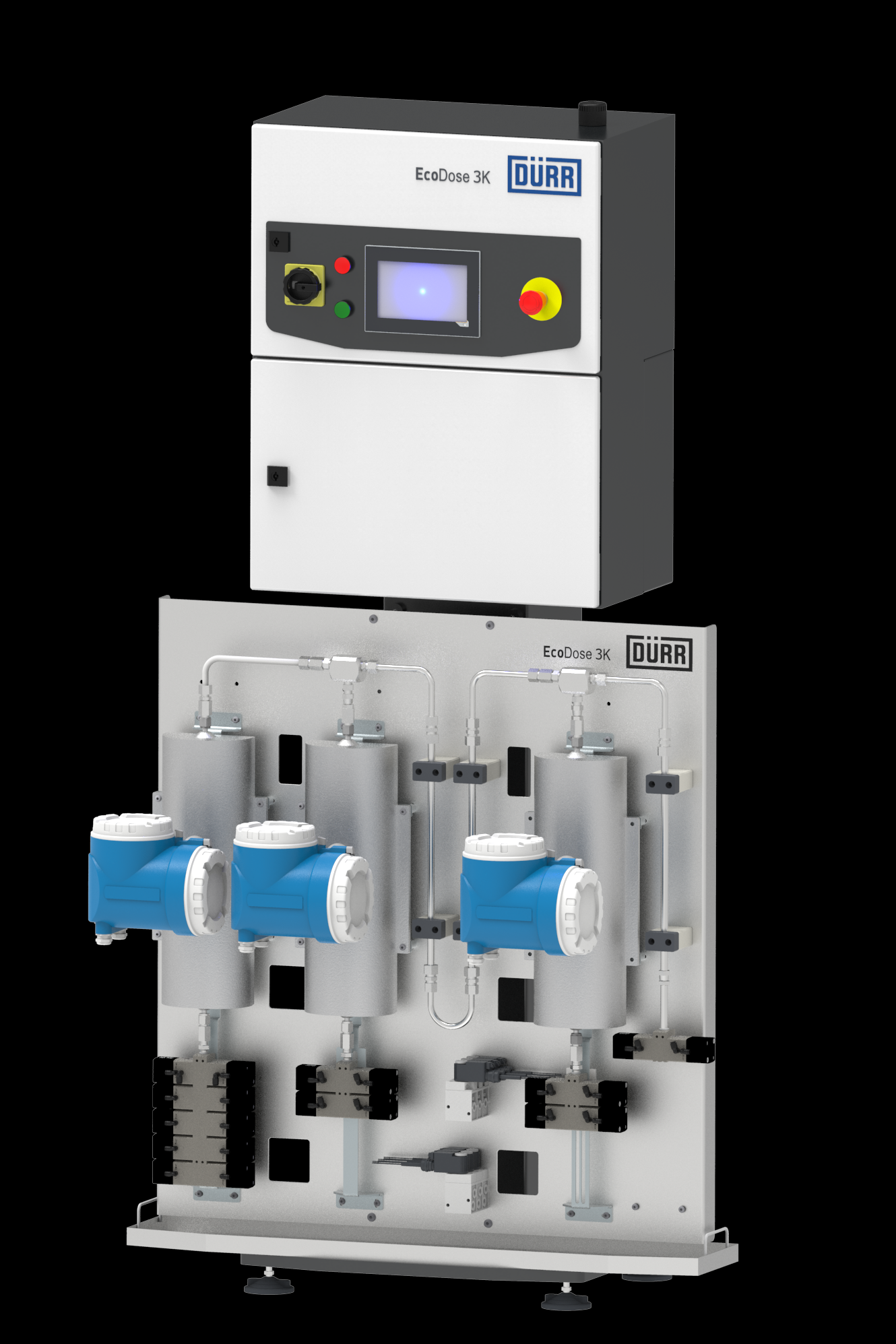 Le système EcoDose 3K se base sur la même technologie d’injection en ligne que le système établi de mélange de deux composants de Dürr. Dans le cadre d’une mise à niveau du système EcoDose 2K, un changeur de couleur, une cellule de mesure et un mélangeur ont été intégrés en plus dans le système. Le contrôleur a également été amélioré pour qu’il puisse pleinement doser, combiner et mélanger automatiquement les trois composants juste avant leur utilisation. À cet effet, il surveille le débit continu du premier composant à l’aide d’une cellule de mesure. Les autres composants à injecter sont dosés selon le rapport de mélange souhaité par ouverture et fermeture des valves. Pour faire en sorte de conserver le bon rapport de mélange, des cellules de mesure surveillent la quantité de dosage.