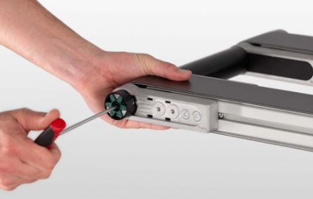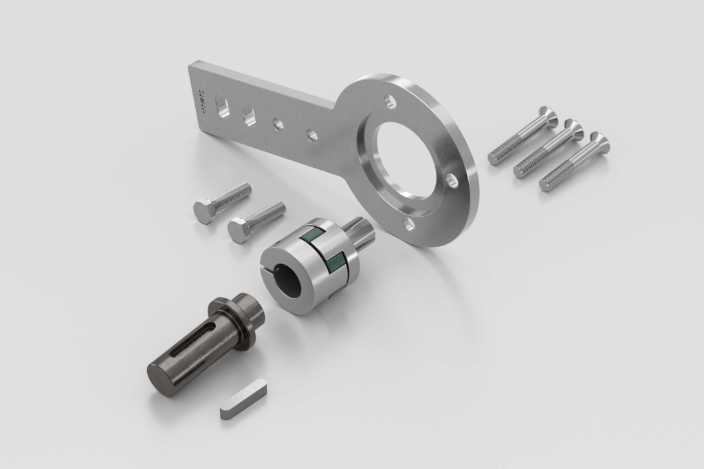 Le kit de fixation moteur 8 40 D16 est un raccordement universel pour relier des moteurs item AC D16 à un convoyeur. Il transmet le couple à la poulie d’entraînement. Le kit de fixation s’installe sur le côté droit ou gauche du convoyeur sur le carter du kit d’accouplement. Le moteur à réducteur intégré est vissé sur le support de couple. L’orientation du mécanisme d’entraînement peut être modifiée par incréments de 90°. L’arbre d’entraînement est introduit dans l’arbre creux du moteur sans usinage supplémentaire. L’accouplement à moyeu expansible compense un défaut d’alignement de la poulie d’entraînement.