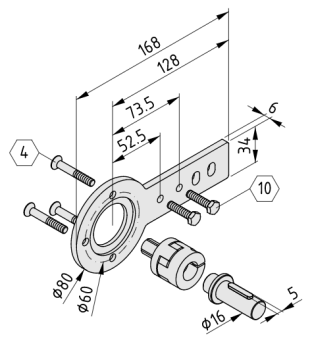 Accouplement à moyeu expansible D16/d13, Al/Ku Support de couple 8 40, acier zingué 3 vis Fhc M6x10-DIN 7991, acier zingué Arbre d’entraînement D16, St, noir 2 vis hexagonales M6x25-ISO 4017, acier zingué Clavette DIN 6885-A-5x5x25, St
