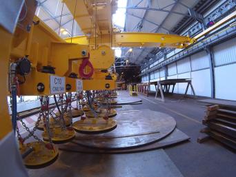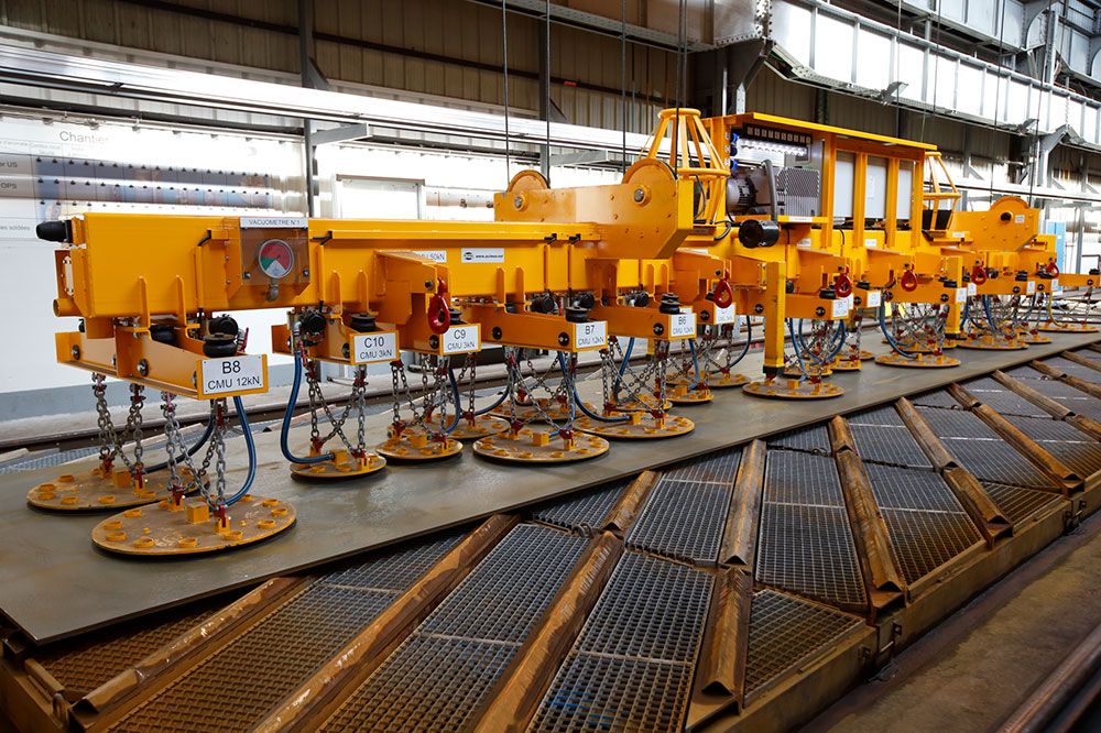 Arcelor a sollicité la société KONECRANES pour la réalisation du pont; ACIMEX s’est occupé de la conception du moyen de levage afin de proposer ensemble une solution clé en main. Le cahier des charges indiquait qu’il fallait pouvoir sélectionner les ventouses à distance : le palonnier équipé de 26 ventouses est doté d’une radiocommande, l’opérateur sélectionne à volonté et à distance les ventouses utiles pour le format à lever.