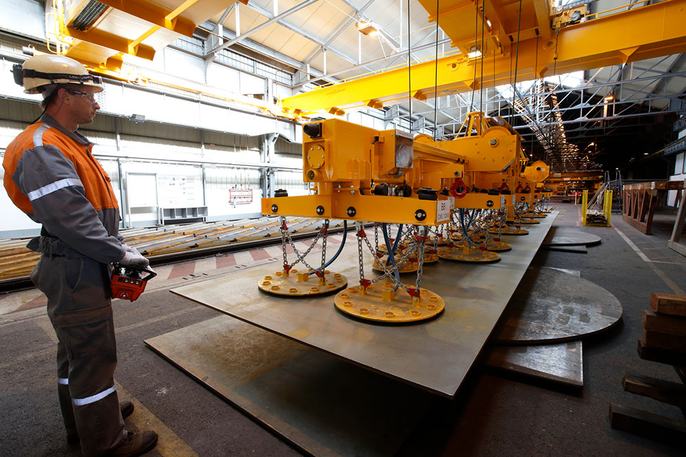 Ce moyen de manutention devait permettre de déplacer depuis la boite à boutons de l’opérateur des tôles de haute résistance et d’un large spectre dimensionnel pouvant aller de 2×2 mètres jusqu’à 4x14 mètres, voire deux tôles de 4x7m. Le second défi a été de réussir à lever des tôles dont l’état de surface était mouillé et sale. ACIMEX a mis en place un système de pompe à vide et de filtration inox spécifique, déjà éprouvé dans des secteurs d’activité extrême de type tunnel. Enfin, le palonnier a été conçu pour une durée de vie de 1.000.000 de cycles. La charge utilisée est comprise entre un tiers et deux tiers de la charge nominale. La charge maximale est donnée pour 15 tonnes.