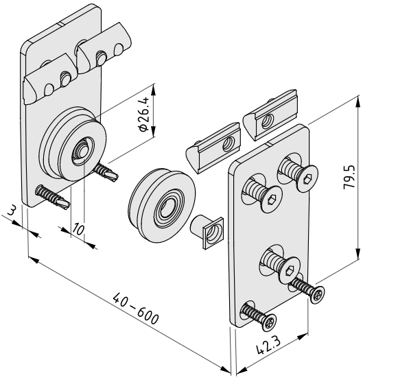 2 plaques de soutien de bande transporteuse BFT 8, acier zingué 2 douilles filetées M6 pour roulement de palier tube profilé D30-d16 Al, acier zingué 2 roulements de palier tube profilé D30-d16 Al 2 roulements rainurés à billes DIN 625-1 628/8 - 2RS, St 4 écrous V 8 St M6, acier zingué 6 vis Fhc M6x14-DIN 7991, acier zingué 4 vis Fhc 3,9x19-DIN 7504, acier zingué Le kit support de bande BFT 8 empêche le fléchissement de la courroie de transport sous son poids propre. Etant donné que cela permet d’éviter les zones d’entraînement, la sécurité du personnel est augmentée. Note : Il convient d’utiliser un support de bande tous les 2000 mm de section de retour. Le support de bande se compose de deux paliers pour un tube D30 (0.0.628.56) qui sert de poulie de soutien dans le brin inférieur. De plus il sert à fixer la goulotte U 40x40 SE (0.0.487.27) et empêche l’entrée.