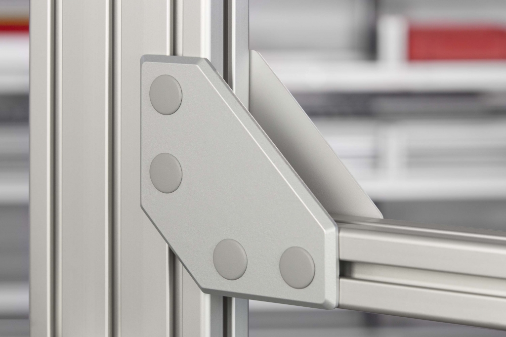 Les équerres et plaques avec des boulons automatiques pré-montés se placent simplement sur la rainure de profilé 8.