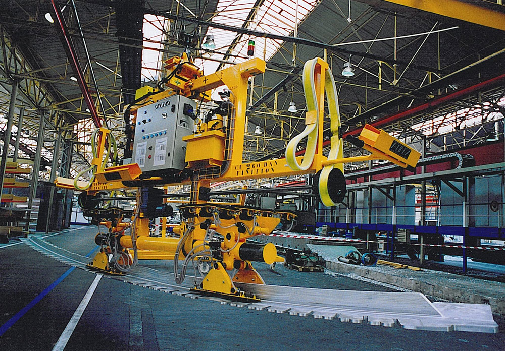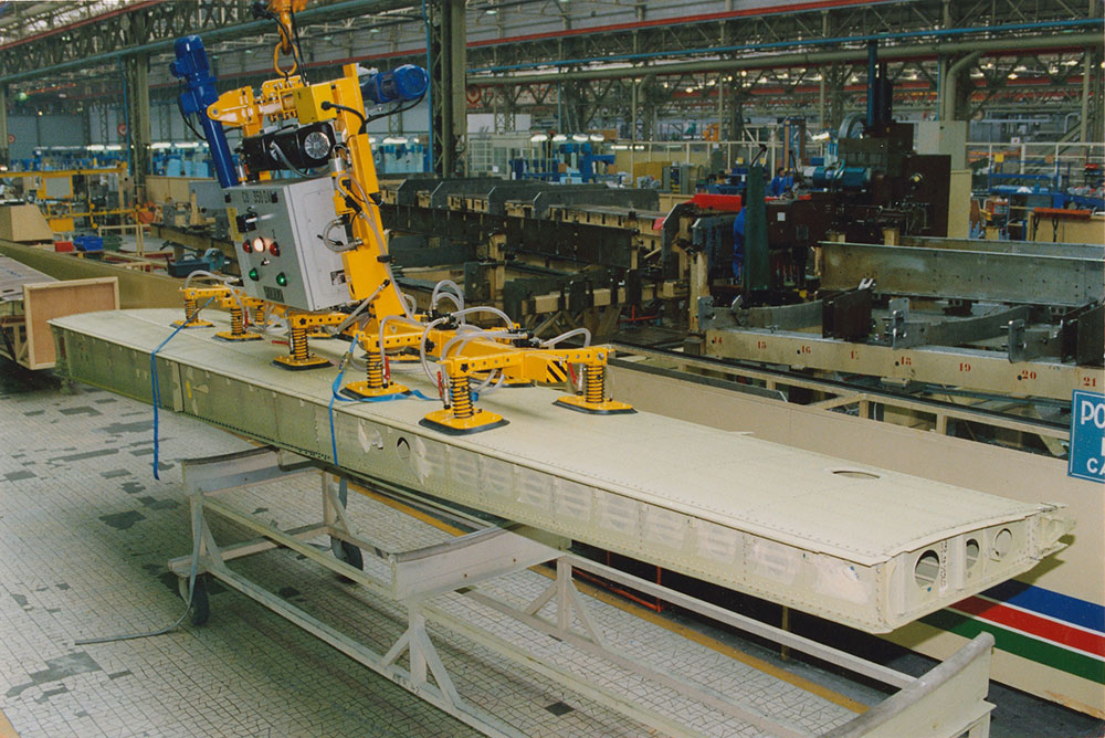 A l’aide de ses ventouses, le palonnier ACIMEX saisit la peau de fuselage (le revêtement de l’avion) disposée sous forme de tôle sur un chariot. Une fois la préhension faite, la tôle est alors basculée, déplacée puis déposée au poste d’assemblage.