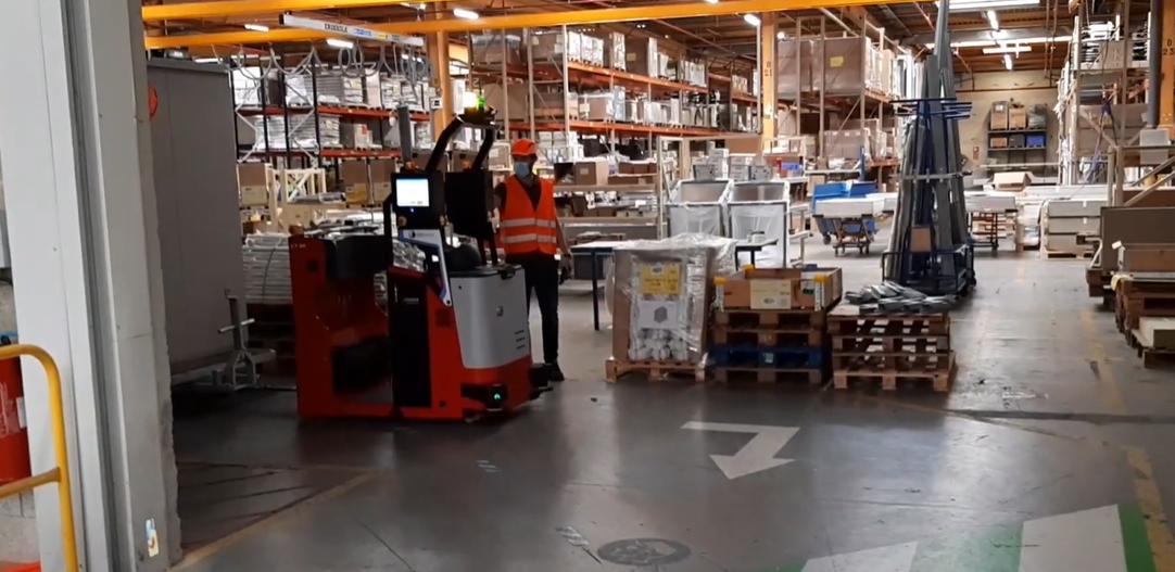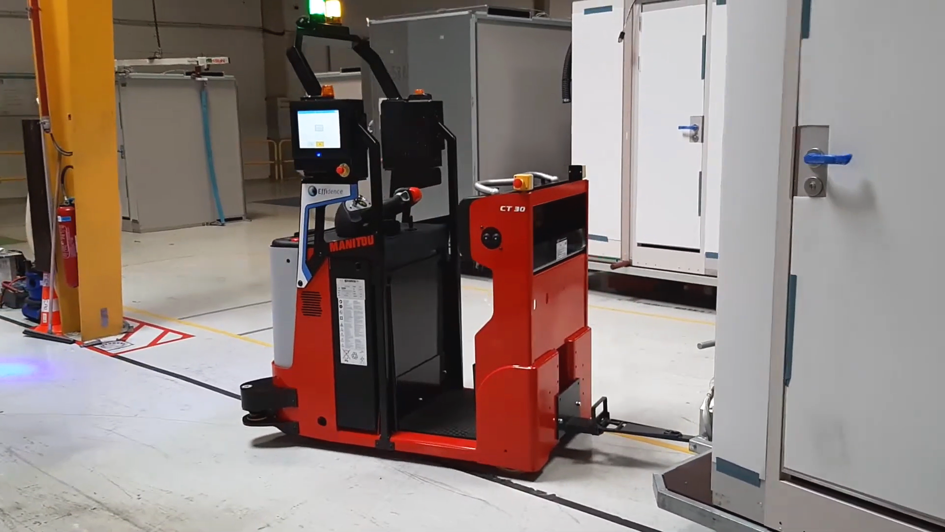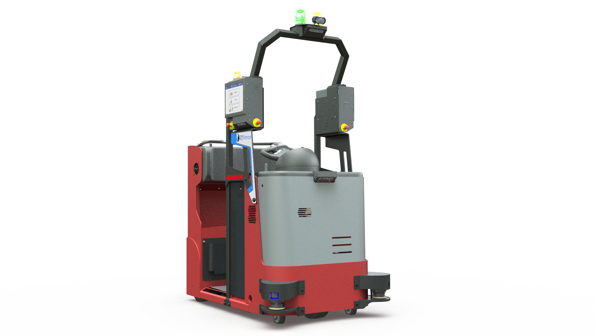 EffiBOT-T est un tracteur logistique robotisé capable de tracter des remorques monotraces jusqu'à 6 Tonnes. Il est utilisable en mode "follow-me", suivi de personne, ou en mode autonome. Il est équipé d'un écran tactile interactifs de chaque côté.