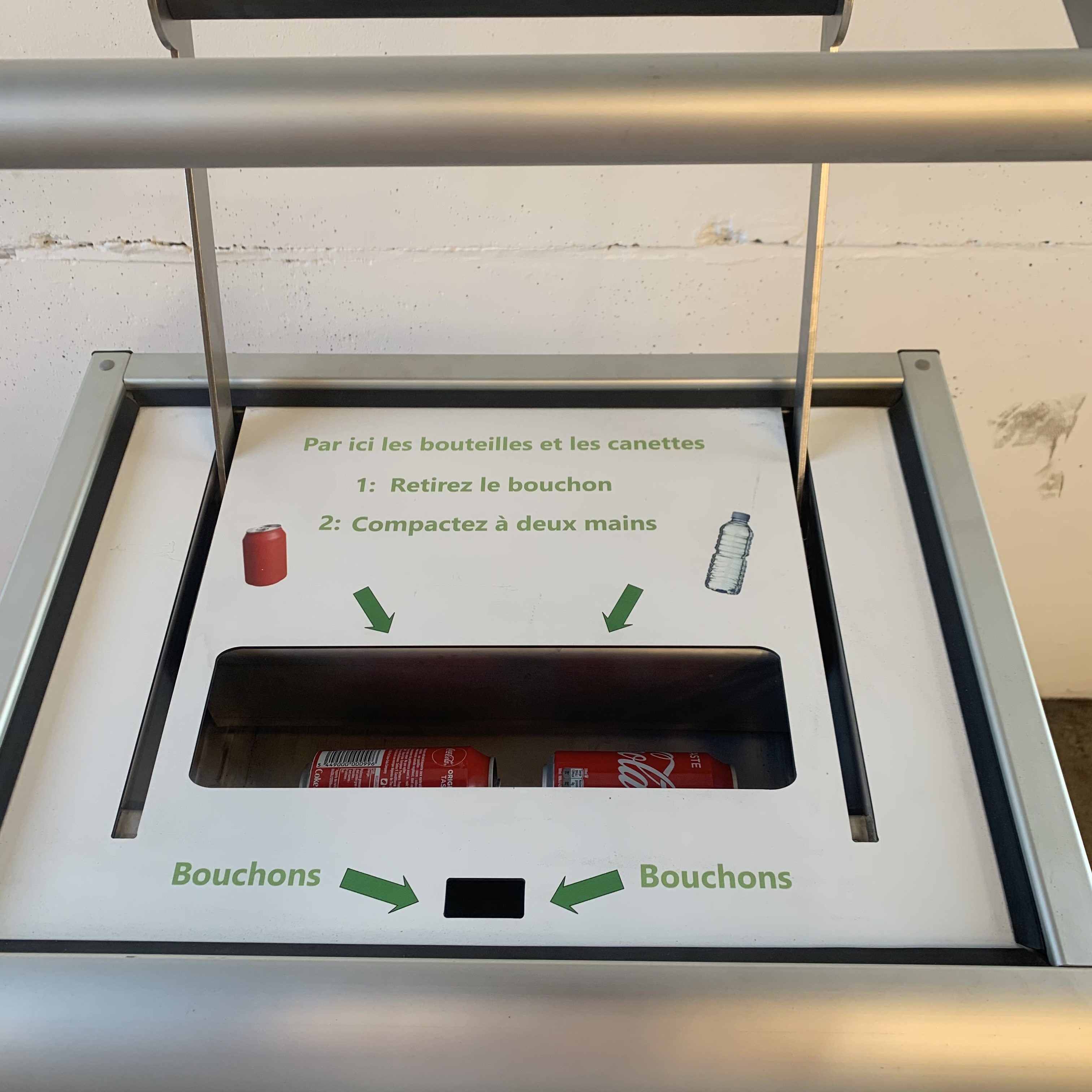 - Capacité du bac d’environ 500 bouteilles PET compactées et 500 canettes alu / acier
