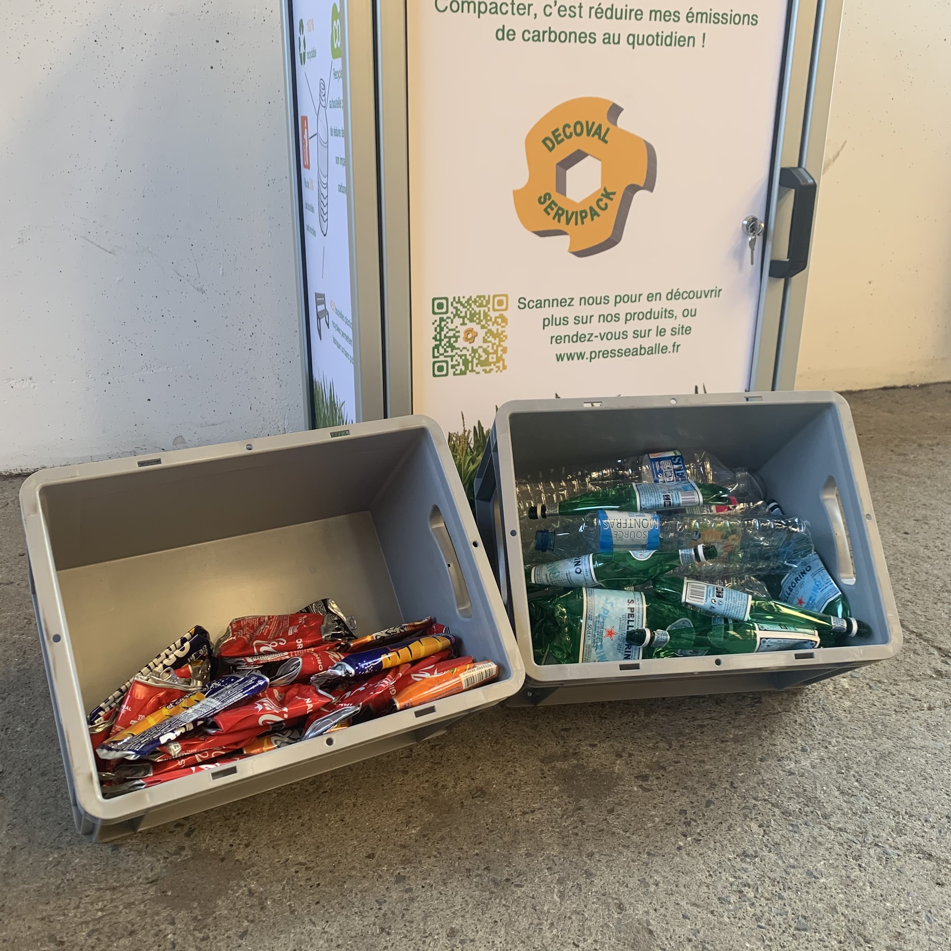 - Réception des canettes et bouteilles compactées dans un bac de collecte placé sous le compacteur